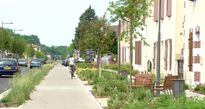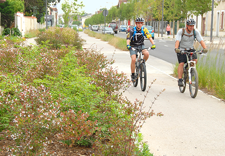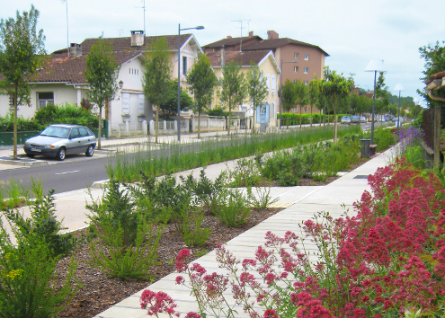À Mont-de-Marsan (Landes), la voie principale menant au centre-ville a permis de rééquilibrer les usages entre automobilistes d’une part et piétons et cyclistes d’autre part. Ces derniers bénéficient depuis 2011 d’un véritable jardin linéaire aux abords de cet axe, jalonné d’espaces de repos. Les matériaux ainsi que les 6 800 végétaux plantés le long de la promenade confèrent un parfum de ville du Sud à un site auparavant sans âme. Au sein des voies douces, arbres et végétaux permettent de sécuriser les passages.