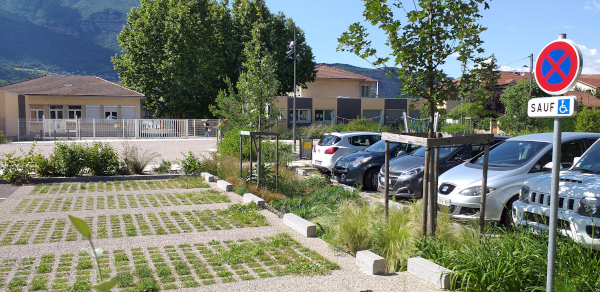 À gauche : Montrouge, allées Jean Jaurès. © Pena Paysages. À droite : Exemple de bandes végétales associées à des noues sur un parking (38). © Epode ingénierie - A.d'Argentré.