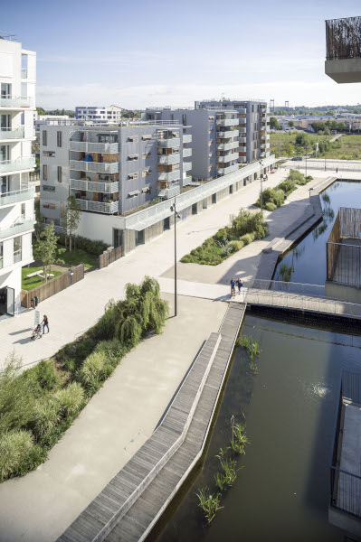La construction de l’écoquartier du Ginko à Bordeaux-Lac2 (33) s’est pour sa part effectuée sous la double bannière de « cité jardin » et de « ville d’eau ». Les surfaces perméables ont été privilégiées au maximum pour favoriser l’infiltration des eaux de pluie dans la nappe phréatique. Concrètement, les eaux pluviales des voiries et espaces publics sont acheminées vers des noues végétalisées et celles des bâtiments pour partie vers des darses d’agrément fermées, perpendiculaires au lac, qui font office de bassins de rétention. « La prise en compte de la trame bleue et de la gestion hydraulique est clairement un des fondamentaux des nouveaux quartiers », note Nicolas Saettel, architecte chez D&A (Devillers & Associés). La spécificité de Ginko repose sur la part des bassins d’agrément de grande taille. C’est assez rare car les collectivités n’ont pas nécessairement les ressources ou les compétences pour gérer tout ce qui peut relever de la fontainerie, qu’elle soit ludique ou rafraîchissante. »