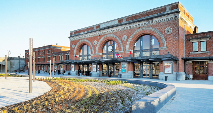 Le ferroviaire permet également de créer ou de recréer des liens entre des énergies et des ressources souvent éparpillées entre le bâtiment de la gare, les quais, le parvis, les voies, les parkings etc. À la gare de Bécon-les-Bruyères à Courbevoie (92), impulsée par la réhabilitation et la mise en accessibilité de la gare portées par SNCF Gares et Connexion, filiale de SNCF Réseau et Île-de-France Mobilités (ex STIF), la démarche communale de requalification s’est inscrite dans un cadre urbain plus large visant à faciliter la gestion des flux piétonniers, améliorer les dessertes, mettre en valeur le patrimoine architectural et, bien sûr, renforcer la présence du végétal. « La revalorisation s’est notamment appuyée sur une gestion plus durable de l’eau via des massifs légèrement décaissés pour récupérer les eaux de ruissellement et la multiplication des essences avec l’emploi de cépées », explique Christian Maillard, directeur des Espaces verts et de l'Environnement de Courbevoie. Extrêmement fréquentée avec une moyenne de 55 000 voyageurs/jour, la place de la gare offre désormais un espace de vie renouvelé pour le quartier et ses habitants conscients d’une réelle plus-value car le végétal a remplacé les places de stationnement. Un jeu de lumière nocturne vient parfaire ce projet qui a été récompensé par une médaille de bronze aux dernières Victoires du Paysage.