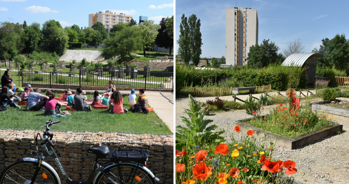 Outre un lien entre les espaces, figuré par un pont joignant Le Cavalier au quartier de la gare, ce jardin est aussi l’ouvrage partagé des habitants qui se sont investis, ensemble, dans le processus créatif et la mise en œuvre de ce parc primé aux Victoires du Paysage en 2018. C’est peut-être cette mobilisation collective et plurielle que reflète l’identité de ce lieu multiforme et ouvert à tous. Jardins partagés, vergers expérimentaux, espaces de détente, aires de convivialité, zones pour les enfants, mais aussi de nombreuses structures mises en place pour la commodité des personnes handicapées ou âgées, rampe d’accès le long du parc, espace potager surélevé, etc.
