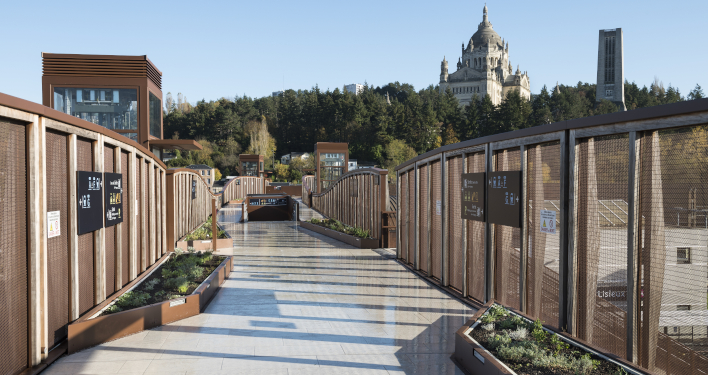 Le projet de Lisieux (14) est emblématique des défis d’aménagement transverses d’un espace détenu par plusieurs parties. Ici, la présence de la basilique Sainte-Thérèse au sortir de la gare posait aussi la question de la prise en compte d’un monument historique classé, d’un site patrimonial et paysager très fort. La mise en place d’une passerelle, qui facilite entre autres l’accès aux quais notamment pour les personnes à mobilité réduite, a permis de supprimer l’espace souterrain trop souvent inondé, tout en ouvrant le bâtiment et les voyageurs à la ville et au sanctuaire religieux. Afin d’amener le paysage à la gare, nous avons également introduit une pinède entre les quais qui permet d’offrir une salle d’attente végétalisée, ainsi qu’un bassin de rétention d’eau dans lequel la passerelle se reflète en cas de pluie. Elle redessine l’horizon de la gare et la rattache à la colline couverte de pins surmontée de la basilique. Une fois de plus, nous avons tenté de remplir le cahier des charges en étant, et en rendant le paysage, vertueux, dans l’objectif de concevoir la première passerelle végétalisée d’Europe avec une attention toute particulière pour le développement durable.
