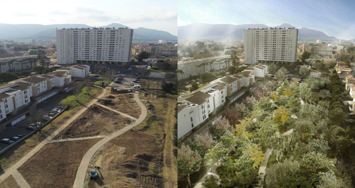 Perspective aérienne des résidences de Mazargues (13). Avant/Après. © TEM.