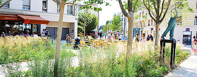 Pour la ville de Montrouge, la conquête de nouveaux espaces verts est un objectif central de l’amélioration du bien-être des habitants. L’aménagement de l’allée Jean-Jaurès contribue à réintroduire de la nature en ville. Ainsi, les emprises de voirie ont été fortement optimisées et les dispositifs routiers ont été supprimés au profit de carrefours urbains et d’un plateau piétonnier traversant reliant les différentes parties de cet espace complexe. Ces gains de place ont bénéficié au confort des piétons, au réseau cyclable et aux commerces de bouche riverains qui ont pu développer leurs terrasses sur des espaces généreusement végétalisés. Pour l’avenue Jean-Jaurès, l’aménagement a opté pour un profil asymétrique en installant une confortable promenade piétonne et cycliste sur la rive sud de la rue.