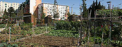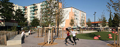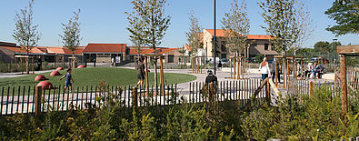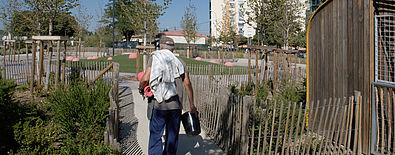 Situé à l’articulation entre une cité et un quartier pavillonnaire, cet aménagement paysager achevé en 2013 a recréé du lien entre deux quartiers. Il a transformé le vaste parking d’antan desservant des équipements, une école, la mosquée, la Croix-Rouge et un terrain de sport en un jardin ouvert et traversant. Le paysage urbain est passé d’un espace très minéral, où le piéton n’avait plus sa place, à un lieu où la composition paysagère considère le végétal comme une armature structurante intégrant des usages de natures différentes. Devant l’école, un parvis a été réalisé. Traité comme une place, c’est un espace ouvert planté d’arbres tiges et intégrant l’aire de jeux. Des jardins familiaux, utilisés par les habitants des quartiers, ont été conçus comme une promenade renouant un lien dans le tissu urbain.