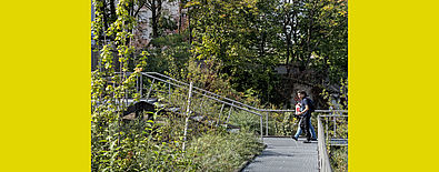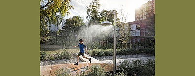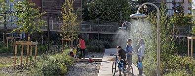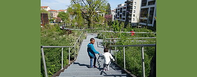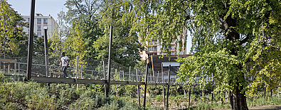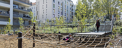 Cet espace de 6 500 m2 propose aujourd’hui plusieurs lieux à différentes échelles : un espace ouvert sur la prairie, un espace humide et ludique avec douches, des aires de jeux pour les petits et les adolescents ainsi qu’un belvédère. De multiples cheminements – accessibles à tous – ont été créés pour permettre une promenade à la fois dans la partie basse et haute du site, grâce, notamment, à l’installation d’une passerelle au niveau des arbres.