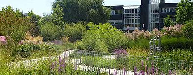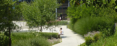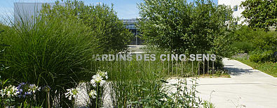 Très fréquenté par les élèves du lycée Nelson Mandela, les habitants du quartier et les usagers du conservatoire de musique, le jardin des Cinq-Sens est à la fois un lieu de passage, transition douce entre la route et les différents équipements, et un lieu de détente pour tous.