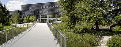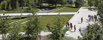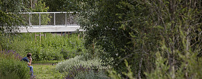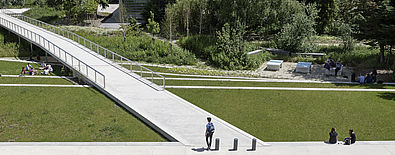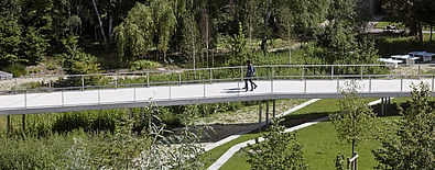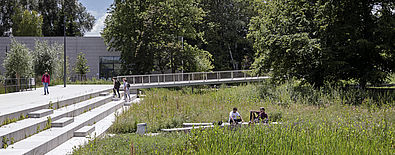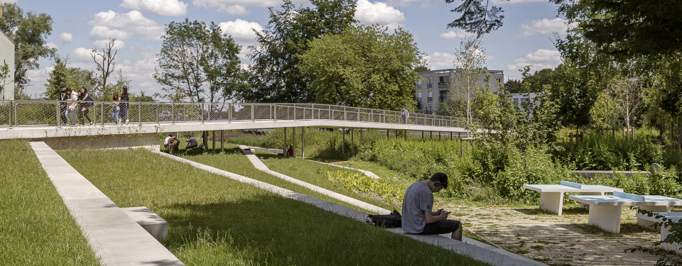 L’accroche du jardin s’inscrit directement en limite du deck en intégrant une rive urbaine, tenue et structurante. Celle-ci se retrouve dans le jardin par la création d’un quai et de gradins, puis une passerelle permettant l’accès au parvis de l’École centrale. Les bosquets d’arbres existants de belle hauteur sont conservés et valorisés dans le projet. Ils constituent l’identité forte du jardin et garantissent une atmosphère de qualité par une présence végétale remarquable.