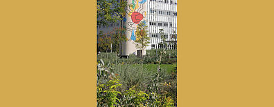 Les motifs paysagers mis en place, tels que le nivellement en buttes moelleuses ou encore les choix de gabarits et coloris végétaux servent discrètement mais efficacement la vie de l’hôpital. Ce jardin offre ainsi un cadre reposant et unique pour les usagers, tout en valorisant la Tour Keith Haring grâce au choix d’une palette végétale en harmonie avec les coloris de la tour. Il relève le défi de proposer un espace paysager original et qualitatif malgré les contraintes techniques imposées par le contexte hospitalier.