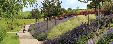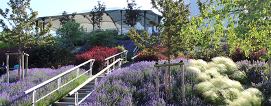 Cette composition en terrasses met en valeur le grand paysage en faisant visuellement disparaître la rue pour créer un lien et assurer une continuité visuelle avec le vignoble tout proche sur le mont Bernon.