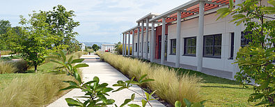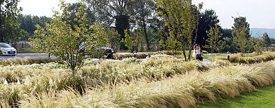 La création de ce siège social a été intégrée à un projet paysager pour le bien-être des salariés de l’entreprise et des visiteurs. Dans ce show-room à ciel ouvert, où le minéral, cœur de métier de l’entreprise, est très présent, l’aménagement paysager a réussi à insérer du végétal de manière harmonieuse. Les graminées, jouet du vent, fréquent dans la région, forment ainsi des vagues végétales balayant l’espace bétonné.