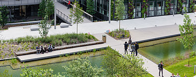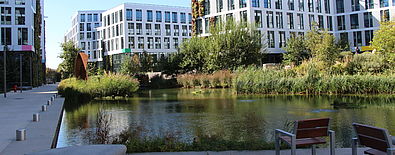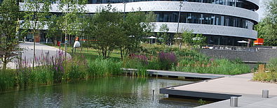 Une alternance de séquences de nature et d’espaces de convivialité et de travail s’organise autour d’un grand plan d’eau. La conception a transformé les fortes contraintes techniques d’accessibilité du site en opportunités d’aménagement.