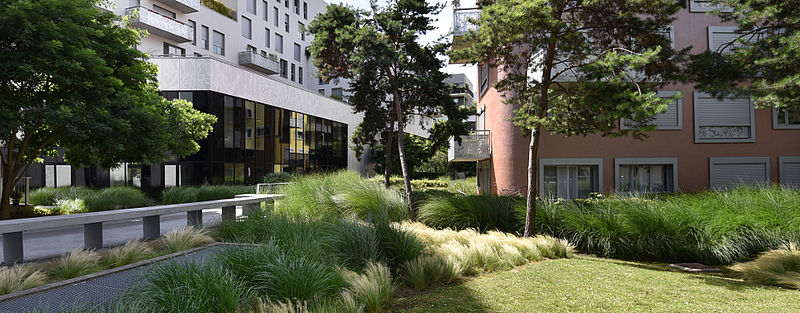 Dans un quartier abritant à la fois des bureaux, des logements en accession, des logements sociaux et un foyer de travailleurs, un cœur d’îlot a été aménagé en jardin. Ce jardin partagé, aménagé en creux, a été conçu comme un lieu de connexion entre les habitants de l’ensemble du quartier. On a cependant veillé à préserver des espaces de tranquillité et des espaces intimistes. Des belvédères et des sièges confortables permettent de profiter pleinement du paysage environnant. Les troncs des pins sylvestres réunis en bosquets sont assez espacés pour que la vue ne soit pas obstruée, ce qui n’empêche pas de profiter pleinement des masses végétales ainsi constituées. La palette végétale, qui se pare d’un coloris doré dès l’automne, est en harmonie avec l’architecture du bâti métallique jouant sur les teintes bronze, dorées et argentées. De leur côté, les graminées animent le jardin au moindre souffle.