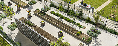 Aux abords des bâtiments publics, l’espace aménagé crée un ensemble ordonné et très paysagé. Place de marché, place jardin ouverte sur rue, jardin ludique, terrasses et jeux d’enfants animent son cœur.