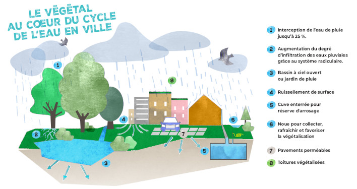 - Une gestion intégrée de l’eau en milieu urbain passe par la création d’espaces perméables de toutes tailles, même petits, et végétalisés.